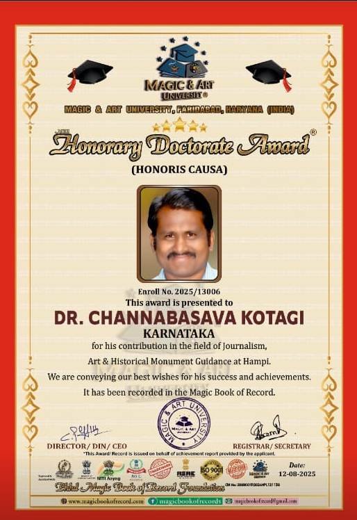 ಹೊಸಶಕೆ ನ್ಯೂಸ್-ಗಂಗಾವತಿ: ಪತ್ರಿಕಾ ಬಳಗದಲ್ಲಿ ಸುಮಾರು 15 ವರ್ಷಗಳ ಸಾರ್ಥಕ ಸೇವೆ, ಚಲನಚಿತ್ರರಂಗ, ನಾಟಕ, ಕಲೆ, ಸಾಹಿತ್ಯ,ರಂಗಭೂಮಿ ಹಾಗೂ ಪ್ರವಾಸೋದ್ಯಮದಲ್ಲಿ ಸಲ್ಲಿಸಿದ ಕಾರ್ಯಕ್ಕಾಗಿ Magic art university, ಫರೀದಾಬಾದ್ ಹರ್ಯಾಣ, ನವ ದೆಹಲಿ ವತಿಯಿಂದ ದಿನಾಂಕ 13-9-2025 ರಂದು ನವದೆಹಲಿಯಲ್ಲಿ ಗೌರವ ಡಾಕ್ಟರೇಟ್ ಪ್ರಧಾನ ಮಾಡಲಾಗುವುದು.